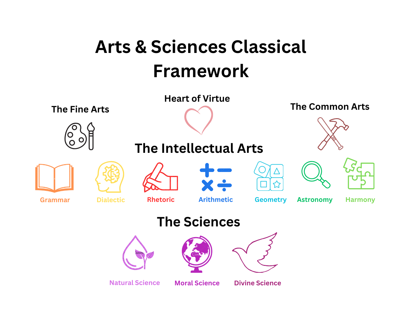 A Classical Education in this framework is one that demonstrates a heart posture of virtue and devotion to God, nourishes the soul, engages the body, and develops the mind using study of the Arts and the Sciences.
